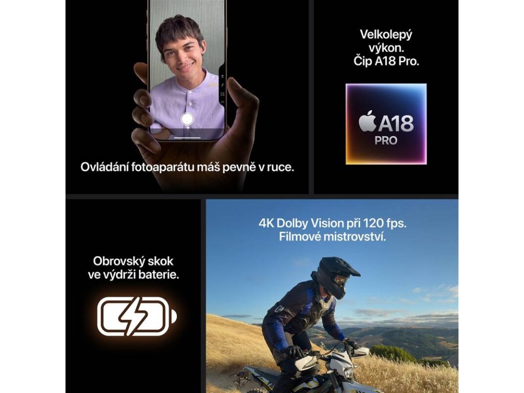 iPhone 16 Pro má konstrukci z titanu třídy 5 s novým, elegantním mikrotryskaným povrchem. Titan má vynikající poměr pevnosti k hmotnosti, a proto jsou tyhle modely neuvěřitelně bytelné a mimořádně lehké. iPhone 16 Pro se prodává ve čtyřech parádních barvách včetně nového pouštního titanu.Pokud jde o vnitřní konstrukci, iPhone 16 Pro díky termální dílčí struktuře ze stoprocentně recyklovaného hliníku a optimalizaci zadního skla pro lepší odvádění tepla udrží až o 20 procent vyšší souvislý výkon než iPhone 15 Pro. Všechno, co tě baví – třeba výpočetně náročné hry – si tak můžeš užívat déle.